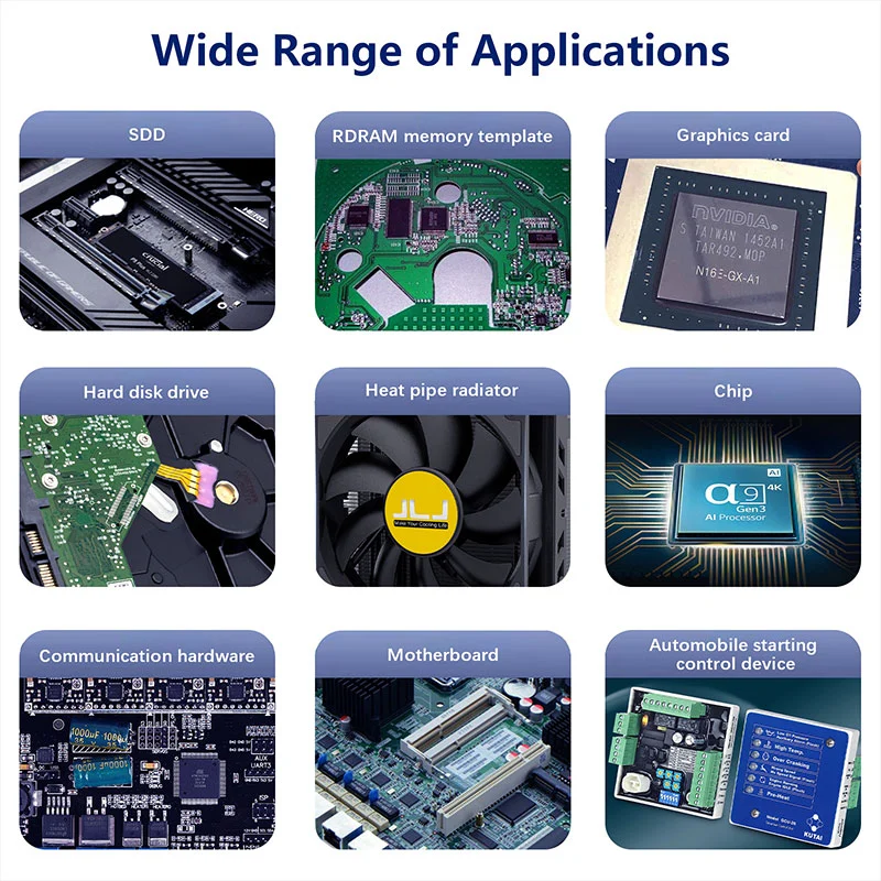 Fiecare lot din siliconul nostru termic suferă un test de îmbătrânire a temperaturii ridicate de 48 de ore, iar intervalul de temperatură de funcționare este de -50 ~ 200 ° C. De asemenea, poate fi utilizat în multe produse, cum ar fi laptopuri, servere, electronice auto, control industrial, module de alimentare, iluminat cu LED, controlere de motor, încărcătoare auto, stații de bază 5G, cipuri AI etc.